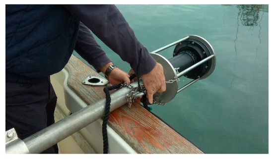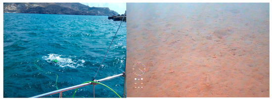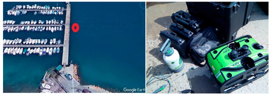 - Visual inspections by an underwater ROV to obtain photographic and video reports. Figure 5 shows the robot deployed from the boat (left) and an image of the bottom at a depth of 9 m (right). The bottom was found to be soft (composed of sand, mud, small stones, and gravel) and shelved slightly with a distance from the jetty.