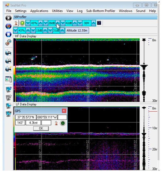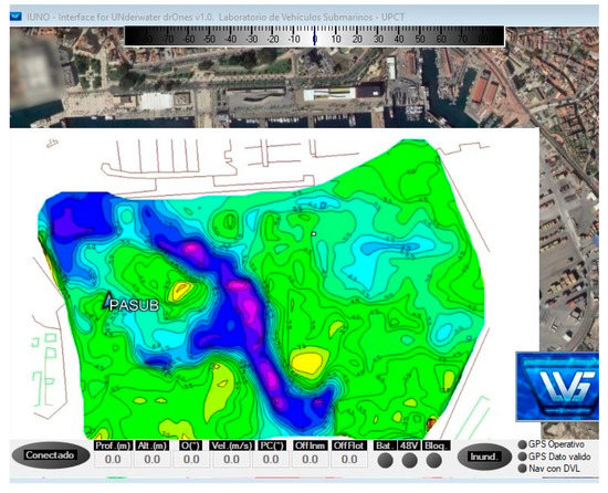- A bathymetric survey, which obtained information on the depth and types of material below the seabed, plus an updated isopach map, was carried out by a sub-bottom profiler (SBP) coupled to the stern of an ASV. The autonomous vessel was programmed to cover Cartagena Bay following parallel paths. Figure 6 shows the ASV’s control, communication, and command software, which included an initial isopach layer of the bay provided by the Cartagena Port Authority.