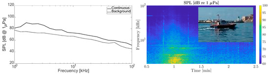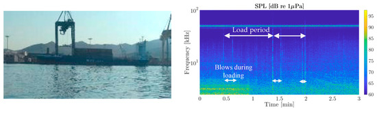- Pile driving [18]—installing piles requires the use of a large mechanical hammer to drill the seabed. Sound levels of mechanical driving can reach up to 260 dB re 1 μPa re 1 m in the absence of noise reduction measures. In [18], the impact of sound measurements had a duration of 0.2 s, the signals showed peak energy at 160 Hz, and also had significant energy up to and beyond 100 kHz.