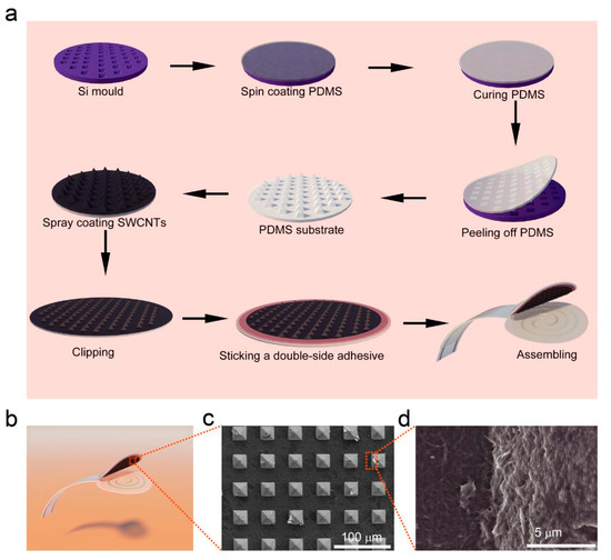 The patterned Si mold was dipped in the mold release agent chlorotrimethylsilane to facilitate the release of the cured polydimethylsiloxane (PDMS) from Si mold. A 10:1 mixture of PDMS (Sylgard 184, Dow Corning, Midland, MI, USA) was spin-coated on the Si mold to obtain a flexible PDMS substrate with a pyramid pattern, and the thickness of the patterned PDMS was controlled by the spin coating speed (1000 rpm). Next, the Si mold covered with PDMS was cured at 80 °C for 2 h. Subsequently, the patterned PDMS was placed on a hot plate (IKA, HP4) at 150 °C and sprayed with an SWCNT/ethanol dispersion (0.5 mL, 0.1 mg/mL, ultrasonicated for 20 min) to form a conductive layer. A sealant was used to attach the conductive film with a pyramid microstructure to a thin circular PET substrate with double-helix Ag electrodes prepared by screen printing. The diameter of the pressure sensitive region is 1 cm.