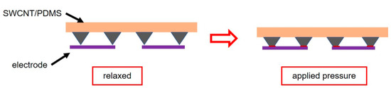 Figure 2a illustrates the fabrication procedure for the flexible pressure sensor, and the detailed fabrication process is described in the Experiment section. As schematically shown in Figure 2a,b, the pressure sensor is constructed by assembling a single-walled carbon nanotube/polydimethylsiloxane (SWCNT/PDMS) conductive film with a pyramid microstructure using a sealant onto a thin PET substrate with double-helix Ag electrodes prepared by screen printing. For pressure sensors with such a laminated structure, the mechanism is mainly based on the principle that the contact resistance between the conductive film (SWCNT/PDMS film) and the electrode decreases as the pressure increases (Figure 3) [20]. Obviously, introducing microstructure is an effective way to increase the sensitivity of the sensor. A matrix of pyramidal microunits (dimensions of 25 μm × 25 μm × 15 μm, Figure 2c) was designed to enhance the sensitivity to pressure. SWCNTs were used as the conductive network layer because of their high flexibility, conductivity, and stability. To ensure that the SWCNTs and the PDMS substrate combined effectively, we placed the SWCNT/PDMS film at 200 °C in an air atmosphere to anneal for 30 min. Figure 2d shows that the SWCNTs were partially coated with PDMS due to the thermal cracking of PDMS during annealing, indicating that the components were well combined.