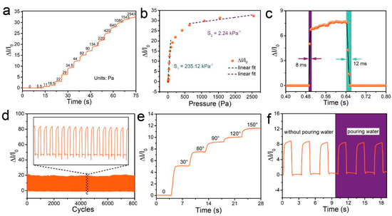 To confirm the high sensitivity, fast response time, stability, and reproducible readings of the designed pressure sensor, we performed pressure-sensing tests. A pressure sensor was subjected to a force that gradually increased in steps. The variation in the relative current change with respect to pressure is shown in Figure 4a. The relative current change (∆I/I0) was calculated as