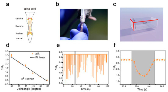 Severe spinal cord injury (SCI) interrupts nearly all brain projections to lumbar circuits, resulting in motor function loss and paralysis [1,2]. Therefore, behavioral monitoring of hindlimb motor function is particularly important after injury, allowing one to evaluate not only motor function recovery but also the integrity of the sensorimotor neural circuit [3,4]. Various readouts have been used to evaluate locomotor deficits, such as endpoint measures, biomechanical measures, and electromyography (EMG). However, these methods are accompanied by several restrictions. For example, scoring is the most commonly used method in behavioral assessment [5,6,7], but it is not sensitive enough to recognize subtle movements and is not suitable for all types of spinal cord injuries. Gait kinematics [8,9,10] requires a whole set of weight-bearing devices and treadmill systems, which render it difficult for some laboratories to perform. Compared with other types of injuries, severe SCI, especially the complete transection injury of the spinal cord, is associated with poor behavioral recovery. Although EMG can be used to observe the recovery of hindlimb function, the implantation of many electrodes damages the hindlimb muscle. Additionally, to operate in a living body, the electrodes must have their wires implanted under the skin, making the site prone to infection. Therefore, there is a high demand for a sensitive, noninvasive device that can effectively monitor the motor function recovery of the hindlimbs after severe SCI.