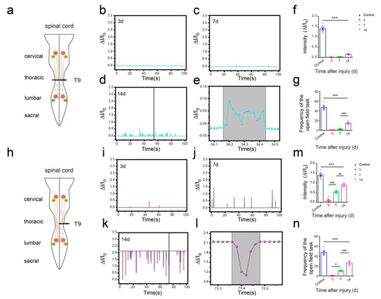 Hindlimb locomotion in open field task (SCI mice). (a) The pattern of the spinal cord (complete spinal transection). (b) Hindlimb locomotion of complete spinal transection mice and its corresponding relative current (SCI 3d). (c) Hindlimb locomotion of complete spinal transection mice and its corresponding relative current (SCI 7d). (d) Hindlimb locomotion of complete spinal transection mice and its corresponding relative current (SCI 14d). (e) An enlarged view of complete SCI 14d mouse (from Figure 6d). (f) Intensity of complete spinal transection mice (n = 6). (g) Frequency of complete spinal transection mice (n = 6). (h) The pattern of spinal cord (unilateral thoracic SCI). (i) Hindlimb locomotion of unilateral thoracic SCI mice and its corresponding relative current (SCI 3d). (j) Hindlimb locomotion of unilateral thoracic SCI mice and its corresponding relative current (SCI 7d). (k) Hindlimb locomotion of unilateral thoracic SCI mice and its corresponding relative current (SCI 14d). (l) An enlarged view of unilateral thoracic SCI 14d mouse (from Figure 6k). (m) Intensity of unilateral thoracic SCI mice (n = 6). (n) Frequency of unilateral thoracic SCI mice (n = 6). One-way repeated-measures AVOVA and post hoc Bonferroni tests were applied. *** p < 0.001 (compared with control mice), # p < 0.05, ## p < 0.01, ### p < 0.001 (compared with SCI 7d mice), error bars, SEM.