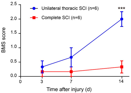 Complete spinal transection or unilateral thoracic SCI was carried out at T9 by modifying previously described methods. After the surgery, the muscle layers, fascia, and skin were sequentially sutured. The mice were returned to a heated blanket to recover from surgery. In addition, postoperative care was provided, including daily subcutaneous injections of antibiotics for 1 week to prevent bladder or wound infections. We checked the mice’s health twice daily for the entire experiment. Urine was expressed by manual abdominal pressure twice per day until the mice regained reflex bladder function.