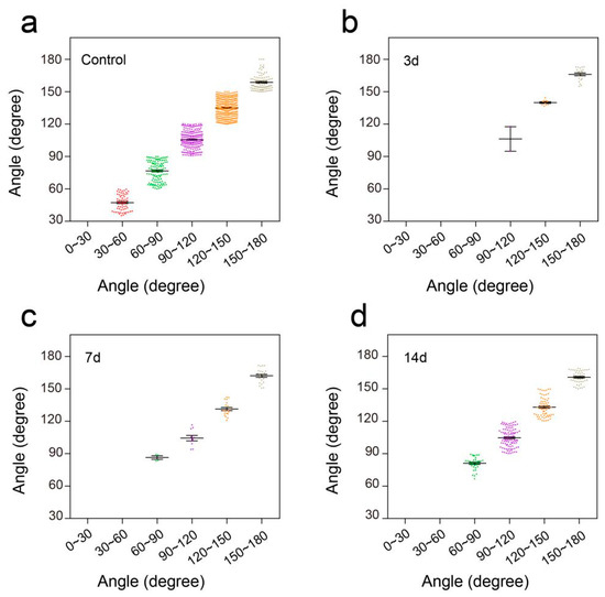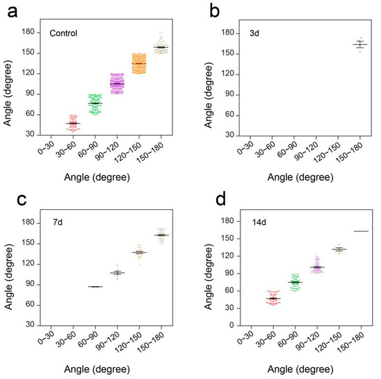 Distribution of ankle angle in open field task. (a) Ankle angle distribution of the control group. (b) Ankle angle distribution of unilateral thoracic SCI 3d mice. (c) Ankle angle distribution of unilateral thoracic SCI 7d mice. (d) Ankle angle distribution of unilateral thoracic SCI 14d mice.3.5. Flexible Pressure Sensor was Used to Evaluate the Lower Limb Muscle Movement of Mice in Swimming.