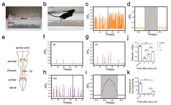 Hindlimb locomotion during swimming. (a) Plexiglas box for swimming. (b) intact mouse swimming. (c) Hindlimb locomotion of intact mouse and its corresponding relative current. (d) An enlarged view of one of the actions in part c. (e) The pattern of the spinal cord (unilateral thoracic SCI). (f) Hindlimb locomotion of unilateral thoracic SCI mice and its corresponding relative current (SCI 3d). (g) Hindlimb locomotion of unilateral thoracic SCI mice and its corresponding relative current (SCI 7d). (h) Hindlimb locomotion of unilateral thoracic SCI mice and its corresponding relative current (SCI 14d). (i) An enlarged view of unilateral thoracic SCI 14d mouse (from Figure 9h). (j) Intensity of unilateral thoracic SCI mice (n = 6). (k) Frequency of unilateral thoracic SCI mice (n = 6). One-way repeated-measures AVOVA and post hoc Bonferroni tests were applied. *** p < 0.001 (compared with control mice), ## p < 0.01, ### p < 0.001 (compared with SCI 7d mice), error bars, SEM.