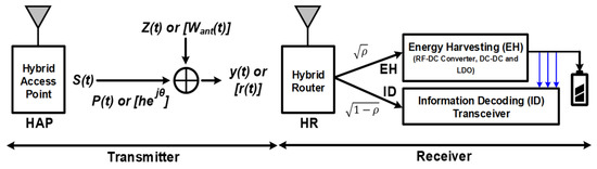 where s(t) is the transmitted signal, h is the complex-valued channel gain with magnitude |h|, and n(t) is the channel noise modeled as additive white Gaussian noise (AWGN) with variance The received signal passes through the EH path during the EH block, which is described as , where Dn is the duty ratio of EH to ID, and Tn is the frame time during one duty cycle operation at the nth channel block. The harvested power is evaluated as