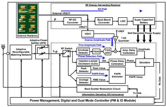 The ID path consists of four main paths—coarse amplitude detection, fine amplitude detection, phase detection, and PAPR path—as shown in Figure 6. The coarse amplitude detection path includes the RF–DC converter of the EH path, a VGA1 with a 1-bit quantizer. With the fine amplitude detection path, the signal is passed through the envelope detector (ED). It consists of a diode used for rectification and a RC low-pass filter to recover the message signal. The message signal gain is then adjusted through VGA2. A 2-bit ADC is used to convert the message signal into binary form. The output of the 2-bit ADC in the fine amplitude path is combined with the output of the 1-bit quantizer in the coarse amplitude path and delivered to the decoders after adjusting the delay between the paths.