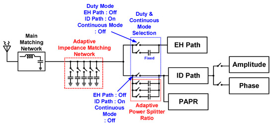 Figure 2 shows a block diagram of the proposed SWIPT. The proposed architecture is mainly divided into two paths: EH and ID paths. An antenna receives information carrying RF signals from the ambient environment and inputs to a matching network. As the signal strength of incoming RF signals varies, an adaptive impedance matching network was designed using the switches being controlled by field-programmable gate array (FPGA) to ensure maximum power transfer from the antenna to the power splitter, as shown in Figure 3.