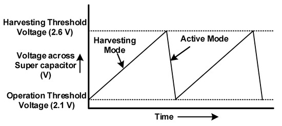 Self-powering and energy-neutral operation in the SWIPT is very essential to provide power to the ID transceiver through the EH receiver, but this task is challenging. Energy harvested through the EH path is small compared to energy required for the continuous operation of the device, especially in batteryless applications. To overcome this situation, two device operational modes were designed: harvesting mode and active mode. During the harvesting mode, sufficient amount of energy is stored in the supercapacitor. All devices in the ID path are inactive during this mode. When harvested energy crosses the harvesting threshold voltage, the SWIPT system switches it to active mode. In the active mode, the SWIPT system will continue with its normal communication operation. When the stored energy drops below the operation threshold voltage, the ID path is disabled, and the SWIPT system is switched to the harvesting mode. This device operation and the voltage across the supercapacitor are shown in Figure 5.
