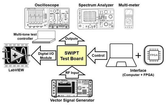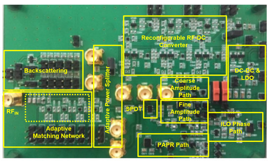 To validate our proposed SWIPT architecture, SWIPT PCB (31 mil Rogers RO4003C substrate) was designed, as shown in Figure 9, with multitone SWIPT board at 900 MHz.