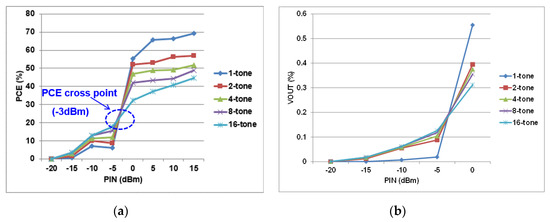 Figure 10 shows the experimental setup. Adaptive matching network was used in the PCB to match the point. The S11 (reflection coefficient or return loss) of −15.73 dB was measured at 900 MHz. Figure 11 shows the measured results of a single-stage RF–DC converter of the EH path. In Figure 11a, the PCE was measured against the RF input power with respect to the number of tones. For low-input power level, multitone had a better PCE performance compared to single-tone. As the input power level increased, single-tone became more dominant with better performance than multitone. At −10 dBm input power level, 16-tones had the maximum PCE of 12.8% for the single-stage RF–DC converter. On the other hand, single-tone had the maximum power PCE of 69% at 15 dBm input power level. All tones tended to have the same PCE at −3 dBm input power level, which is called the PCE cross point. Figure 11b shows the output voltage VOUT versus input power level with respect to a number of tones.