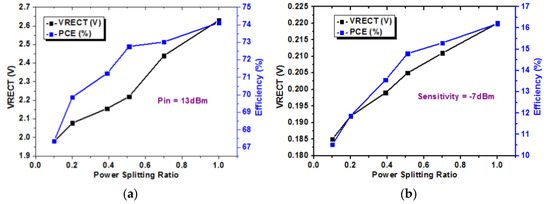 Measured PCE and output voltage of the rectifier (VRECT) of a single-stage RF–DC converter with respect to the power-splitting ratio when the input power level was (a) +13 dBm and (b) −7 dBm. (c) The measured PCE and data rate with respect to the power-splitting ratio at different input power levels.