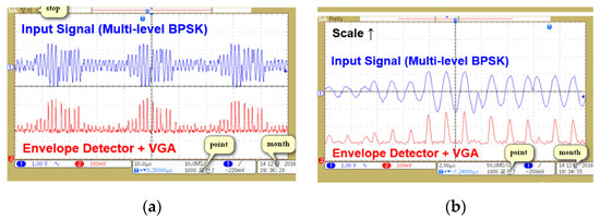 Figure 13a,b shows the output of the ED after the RF–DC converter operation. Signal gain was controlled through VGA2. The output of ED was applied at the input of 2-bit ADC, which consisted of three comparators with reference voltages of 157.5, 148.5, and 145.2 mV, respectively. Three comparator outputs were encoded into a 2-bit ADC code by applying a logical operation in LabVIEW. Comparator output was read through NI 6555 high-speed digital input/output (I/O) module. Encoding was performed through one XOR and two AND gates to generate a 2-bit ADC code.