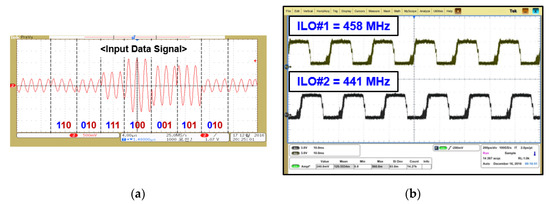 Figure 15 shows a modulated signal through a constellation symbol map that recovered 2-bit amplitude information according to the transmitted symbols. Phase change in the input signal was detected through ILOs. It consisted of two oscillators—ILO#1 and ILO#2—free-running at 458 MHz and 441 MHz, respectively. Phase changes in the input signal as per constellation are shown in Figure 16a,b, respectively. ILOs output single-bit information for about 180° with a change in the input signal.