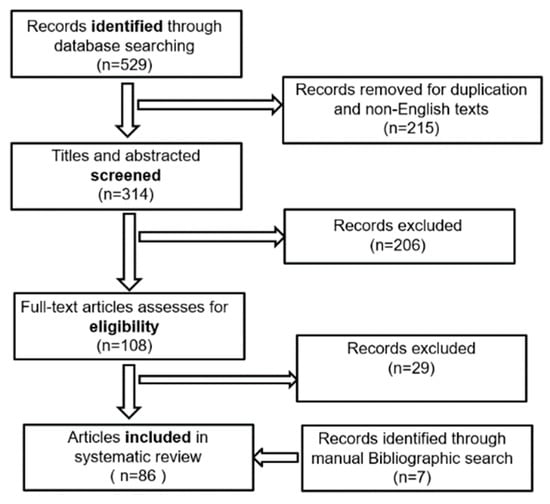 A total of 314 publications, identified through the database search, were set for the title and abstract screening; of these, 108 articles were selected for the full-text review. However, 29 failed to satisfy the eligibility criteria, and were excluded. A manual bibliographic search also identified seven additional publications qualified to be included for the full-text review. Thus, 86 publications ultimately fulfilled the eligibility criteria for this review. Figure 1 illustrates the methodology and results of the review process.