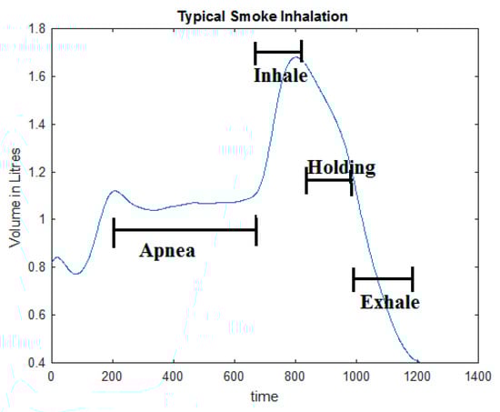 Regarding smoke inhalations, smokers generally do not inhale during cigarette lighting [], and inhale a very small amount during the initial puffs. To avoid irritation in the throat in the initial puffs, some smokers briefly hold the smoke in their mouth. Major smoke inhalations are done either by deep breathing, and occasionally by ‘Frenching’ (pushing some smoke back into the air without exhaling completely, and inhaling it through the nose—also referred to as a ‘Chinese Drawback’) []. A smoke inhalation can be summarized as a sequential process of: (a) A cessation of normal air-intake (breathing apnea) during cigarette holding; (b) A sharp increase of tidal volume and airflow due to smoke inhalation into the lungs; (c) Occasionally a brief period of smoke holding in the lungs, and; (d) A slow or forced exhalation, either through nose or mouth []. This characteristic respiration pattern may also be an indicator of smoking. Figure 2 illustrates a typical smoke inhalation in terms of changes in the lung breath volume.