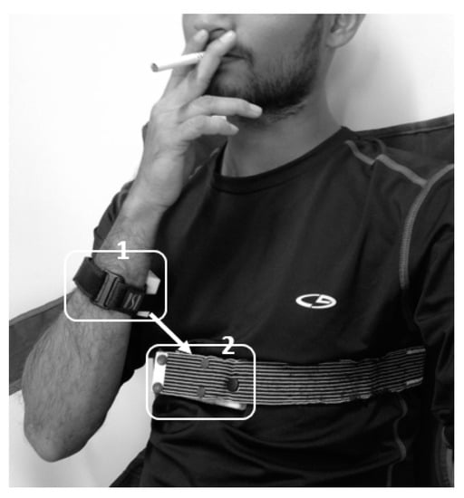 The philosophy behind the implementation of wearable sensors in smoking detection requires a thorough comprehension of the cigarette smoking process. The frequency or pattern of cigarette smoking generally varies between individuals or brands of the smoked cigarette; however, a few similarities between behavioral and physiological phenomena are always present [,]. An average smoker smokes a cigarette in 4–8 min [] with 8–16 puffs []. The process starts with the removal of a cigarette from a packet, generally using fingers (sometimes using the combination of teeth and lips), putting the filtered end in the mouth, and lighting up. The number of consumed cigarettes may be tracked from the cigarette packet or holder, if it is instrumented accordingly. Also, smokers usually carry a personal lighter or match, and use it to light their cigarettes. The frequency of cigarette consumption can be identified from cigarette lighting events [].