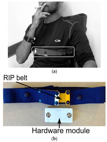 Sensor modality: Among different lung function measurement approaches [,,,,], at present, only Respiratory Inductance Plethysmography (RIP) [] technology has extensively been employed to identify smoking-specific breathing patterns. An example of RIP breathing sensor implementation is provided in Figure 6. Electrical Bio-impedance (BEI) Measurement-based breathing measurement has also been introduced in Imtiaz et al. []. The RIP sensor, which consists of a conductive thread or wire sewn, has current applied to a conductive loop, and an opposing magnetic field is generated with strength proportional to the loop’s area, according to Lenz’s law []. The RIP belt, when placed around the abdominal or thoracic area, obtains respiration signals by measuring changes in the belt’s inductance caused by contraction and expansion of the lungs. This measurement is independent of the tension in the band, and not susceptible to any trapping of the RIP band to the body (unlike piezoelectric sensors []) or associated artifacts. Also, the bands are normally made of elastic materials, so they exert comfortable pressure and do not interfere with breathing patterns.