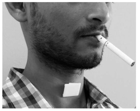 During the past decade, a wide range of technology-driven smoking assessments has been investigated, such as expired CO monitoring [,], biomarkers [] and image processing [,,]. However, no usable pattern of inhalations or smoking habits can be drawn from expired CO- or biomarker-based approaches []. A commercial handheld monitoring device, the Clinical Research Support System (CReSS) [], was developed to acquire and store behavioral information about smoking in the natural environment. However, the use of this ‘smoke-through’ CReSS device may affect the pattern of inhalations in many smokers due to its obtrusiveness and large size []. Moreover, the ability of this device to capture all instances of smoking does demand that the people being monitored smoke all their cigarettes through the device—not all smokers are compliant with these instructions. Surveillance camera-based imaging methods require the installation of video cameras in all possible smoking locations, which is not feasible at the community level [].