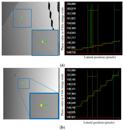 This article focuses on the multifrequency phase-shifting (MFPS) technique, which is the most widely used in industrial applications. Although this technique can avoid phase ambiguity, it does have a critical drawback. The MFPS technique uses a combination of several phase maps with different fringe pitches; hence, measurement uncertainty is amplified and affects the final result. Each phase map of a single frequency has phase noises, which will lead to 3D measurement errors. An example of measurement uncertainty propagation after fringe-order calculation is illustrated in Figure 1, which also compares results between temporal phase unwrapping (multifrequency) and spatial phase unwrapping (Goldstein). Figure 1a shows an unwrapped phase map and its cross-section, which was obtained using temporal phase unwrapping. As can be seen, there is a jump point on the continuous surface caused by the wrong fringe order. However, this jump point disappears in the same pixel location in the unwrapped phase map shown in Figure 1b. Due to the measurement uncertainty of that pixel being amplified in fringe-order calculations, MFPS yields a wrong fringe order. The measurement uncertainty propagation of single- and multifrequency phase shifting techniques will be analyzed and modeled in Section 3.