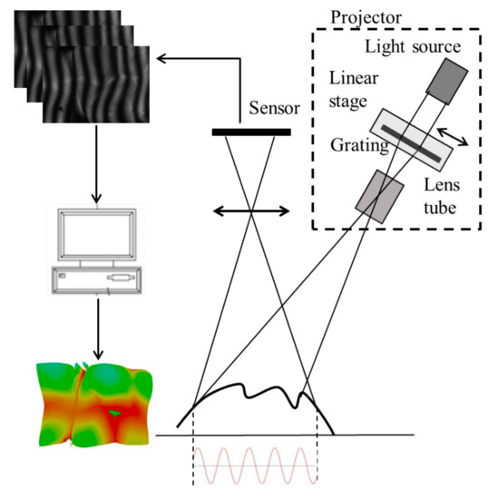 - Takeda, M.; Mutoh, K. Fourier transform profilometry for the automatic measurement of 3-D object shapes. Appl. Opt. 1983, 22, 3977–3982. [Google Scholar] [CrossRef] [PubMed]