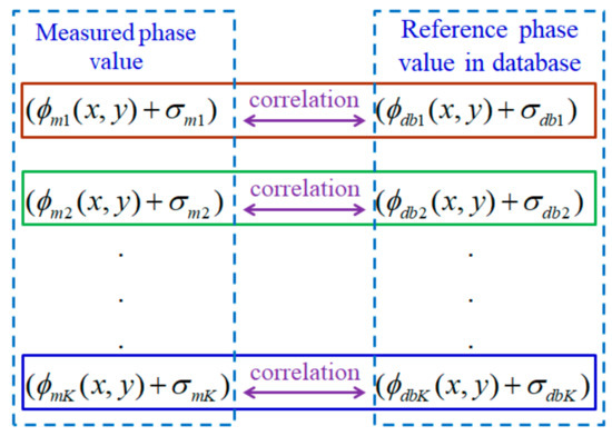 where and are the phase values of the measurement and the stored database of frequency order . In addition, can be further obtained using Equation (15),