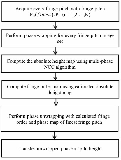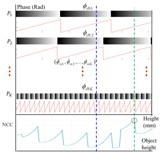 Figure 7 presents a flowchart of the proposed NCC-based multiphase depth measurement algorithm. In a measuring task, a set of K-frequency phase-shifting images is acquired, in which the phase maps of every single frequency are calculated. The wrapped phase maps are employed to calibrate the absolute height using the proposed NCC-based method. The final unwrapped phase map can be reconstructed using the relationship in Equation (14), in which the absolute phase can be reconstructed accurately with the extracted fringe order and the wrapped phase of the finest fringe pitch .