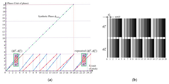 To demonstrate that each wrapped phase of the synthetic fringe is unique, an example with a fringe pitch of two different frequencies is considered, in which are set at 4 and 5 units, respectively. According to Equation (7), the synthetic fringe pitch is at 20 units, in which there exist four fringes with spacing and five fringes with spacing . Within the range of the synthetic pitch, it is important to point out that all of the phases are unambiguous and unique [38]. The concept of this idea is illustrated in Figure 5a.