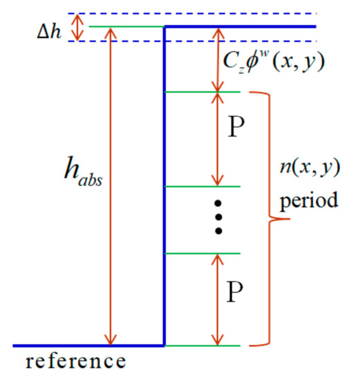 Figure 8 illustrates the proposed idea of how the missing fringe order is related to the absolute height in a single pixel. The absolute height of a single pixel can be defined by its wrapped phase value and the fringe order incurred by the object’s absolute height (Equation (28)). The accurate mapping relationship between the fringe order , the wrapped phase , and the unwrapped phase can be described by Equation (29). The unwrapped phase can be extracted using the calibrated absolute height and the relationship between the absolute phase and the reference phase . In addition, the relationship of the calibrated absolute height with the calibrated phase-to-height coefficient, , and the unwrapped phase can also be expressed by Equations (28) and (29), respectively. Thus, an accurate fringe order can be determined using the calibrated absolute height, wrapped and reference phase maps, as in Equation (30). Equations (28) and (29) are