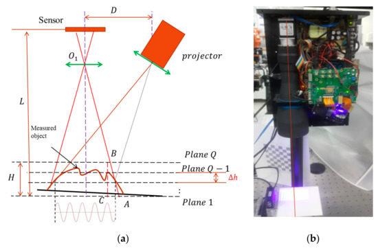 During the experimental measurements, a projector projected sinusoidal patterns onto an object surface, and distorted fringe patterns were acquired by a sensor (see Figure 9a). To build the database, the reference plane was aligned perpendicularly to the optical axis and shifted along the optical axis of the sensor lens. Each five-step phase-shifting image set was acquired 30 times. The 30 image sets were then averaged to minimize the random error from illumination and the sensor. In practice, the measurable range was H = 10 mm, and one shifted step of the reference plane was mm; hence, there were, in total, Q = 100 layers stored in the database. A high accurate ceramic plate (flatness and roughness <5 µm) was chosen to build the database for absolute height calculations.