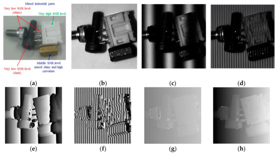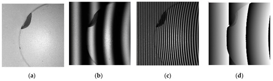 The final unwrapped phase map will be extracted by applying Equations (4)–(6) when is replaced by . Other temporal phase-unwrapping approaches are to extract the absolute phase with the aid of special structured patterns such as Gray code or speckle [28,29]. In these approaches, the fringe order is encoded by serial Gray-code patterns. N patterns can only encode fringe orders, thus prolonging data acquisition. Furthermore, the edges of captured binary patterns blur due to the defocusing of the optical system. Incorrect absolute phases frequently appear on the object’s sharp edge or on the boundary between adjacent binary fringe regions.
