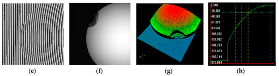 Figure 10a–c shows an example of the images being captured on a hemisphere target, which was illuminated through projection of the largest fringe pitch (121 pixels) and the shortest fringe pitch (12 pixels) (four fringes (12, 100, 110, and 121) were applied). Figure 10d,e shows the wrapped phase maps of Figure 10b,c, respectively. The absolute height map calculated using the proposed algorithm is illustrated in Figure 10f. The 3D profile and its height cross-section are presented in Figure 10g,h. As can be seen in Figure 10, the measurement results showed that the absolute height of the hemisphere surface could be successfully reconstructed using the proposed NCC-based algorithm.