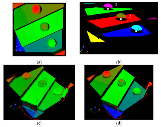 The absolute distances between the centers of the three different spheres were extracted using their measured point cloud. Figure 13a illustrates the measured 3D profile of the step-height target with three spheres mounted on top of it. Figure 13b illustrates the segmented point cloud and calculated sphere centers using a random sample consensus (RANSAC) fitting algorithm. To estimate the stability of the probe, the Euclidean distances between the centers of the spheres were measured 30 times under the same conditions. Table 2 shows that the standard deviation of the probe could reach 5.4 µm. Figure 13c,d illustrates two broken areas inside the red ellipses, in which the proposed NCCMFPS method had a much higher signal-to-noise ratio (SNR) reconstruction around the edges.
