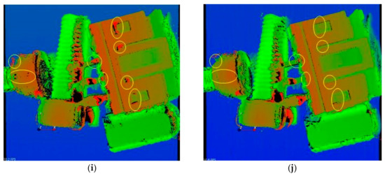 The most challenging problem using the FPP technique was nonuniform reflectivity and the high curvature of the measured object’s surface, which appears in Figure 15a. Several industrial parts were mixed together, with shiny and black screws giving large reflectivity variations; a white plastic electrical connector representing a good SNR target; and a copper bolt representing a target with a medium level of SNR but with high curvature. Figure 15g is a fringe-order map of mixed industrial parts measured using MFPS. There were several broken regions on the shiny screw and in the corner areas of the white plastic connector. The wrong fringe order in these regions propagated to the final measured 3D profile, as presented inside the yellow ellipses in Figure 15i. These broken areas were calibrated to their correct positions using NCCMFPS, as shown in Figure 15j. Taken together, the experimental results demonstrated that the proposed measurement method (NCCMFPS) could effectively calibrate fringe-order errors caused by the MFPS algorithm.