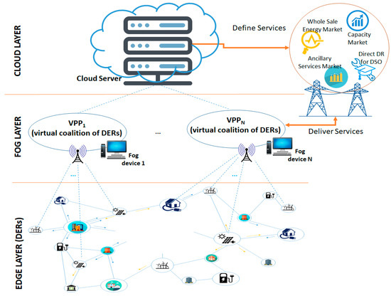 In reference [34], the authors investigate the possibility of applying edge computing principles for smart grid management and identify challenges and open issues in this context. By using a distributed decentralized architecture provided by the edge computing paradigm, scheduling and fault tolerance aspects of a smart grid can be addressed while also solving problems related to distributed generators and prosumers interaction. Similarly, in reference [35] an analysis of edge computing solutions for the smart grid is conducted. The authors focus on modeling smart homes integration in smart grids when dealing with a limited power budget, highlighting privacy as the main advantage. An approach for time-series analytics with the edge computing applied to the smart grid and manufacturing industries is presented in reference [36], but the focus lies more on integrating the wired/wireless communication networks that will use real time computing at the edge of the network. Reference [37] describes the energy lattices as fog computing architecture applied for smart grids. In this architecture, devices such as smart meters and micro-grids will achieve energy efficient management using availability and price as the main criteria. Authors of reference [8] discuss the existing fog computing approaches and identify important functionalities for such platforms in the area of sustainable smart cities. The smart power grid is identified as an important use case for fog computing especially for reducing operational costs, integrating renewable energy systems, balancing the system, and monitoring power generation, demand, and storage. In reference [38], an energy management-as-a-service over fog computing platform is introduced for both home energy management and microgrid-level energy management. The approach uses low-power and low-cost devices for computation, storage, and communication to build a service oriented fog computing platform. In reference [39], an arbitrage strategy is defined for VPPs participation in ancillary services market targeting the spinning reserve and frequency restoration reserve services. The optimization model considers the supply–demand balancing, transmission network topology, and security targeting the VPP’s profit maximization. In reference [40] a two-stage stochastic programming approach is used to address the problem of VPP trading in a market of ancillary services. It incorporates a risk-averse optimal offering model based on conditional value-at-risk while considering the uncertainty regarding energy generation/consumption and energy prices in balancing markets.