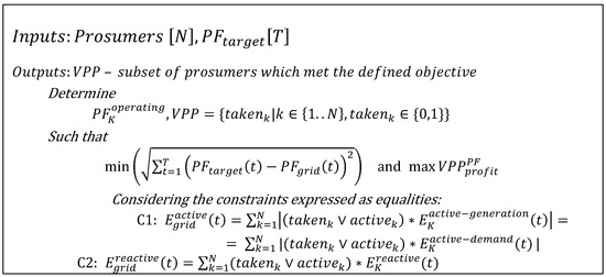 The optimization problem is summarized in Figure 3, and has as inputs the set of prosumers available to be considered in the VPP coalition and the target that must be achieved at the local grid level.