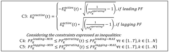 A load that “supplies” reactive power is a capacitive load with a leading power factor, while a load that “consumes” reactive power is an inductive load with a lagging power factor. A leading power factor implies that the reactive component of the power is negative because reactive power is supplied to the circuit and the phase angle in this case is in the fourth quadrant. A lagging power factor means that the reactive component of the power is positive because reactive power is consumed from the circuit, and the phase angle in this case is in the first quadrant. Furthermore, if the resource has a constant power factor, then the bounds are given as equal. Using the general active and reactive power formulas as well as the power factor type (leading or lagging) of a resource, the active –reactive energy relationship determined as the following: