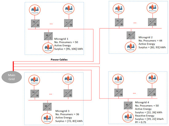Figure 4 presents the simulated scenario in which we have considered four micro-grids (ids 1 to 4) with a various number of prosumers, the first three with a potential surplus of active energy by activation of additional generation prosumers, while the forth one has a low PF value due to an actual surplus of reactive energy. Table 1 presents the ranges of parameters in which the prosumers part of each microgrid were randomly generated.