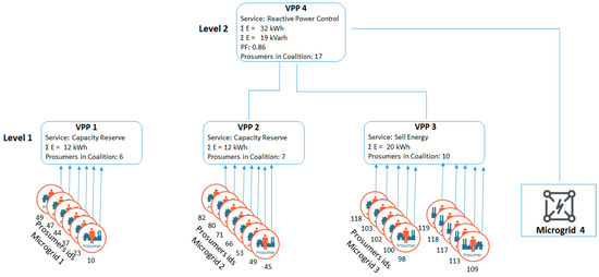 The optimization problem is trying to identify the prosumers that may be activated to provide additional generation from microgrid 1, 2, and 3 and to aggregate them into VPPs by combining their power profiles such that the surplus of reactive power in microgrid 4 is compensated and the PF improved. At the same time in the construction of VPPs based on additional generation from microgrids 1, 2, and 3, we have considered price signals in the energy market and the provisioning of capacity reserve services. As a result, coalitions of prosumers are constructed in VPPs organized in a two-layer hierarchy (see Figure 6).