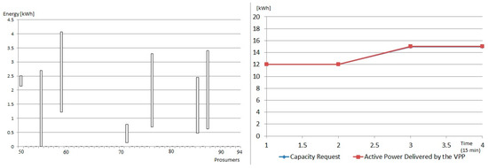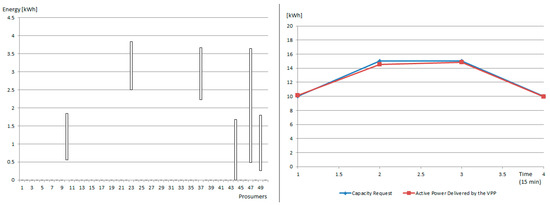In the case of the microgrid 2, a coalition of prosumers is constructed in a VPP are also able to provide reserve capacity on demand. In this case, eight prosumers from the microgrid are selected and aggregated, being able to provide the requested replacement capacity with an accuracy of 98% (see Figure 8).
