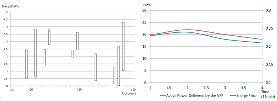 In the case of the microgrid 3, the VPP is also created to optimally combine the energy profiles of the energy prosumers grouped in the VPP so that the aggregated amount is proportional to the energy prices from the energy market as depicted in Figure 9 (right). In the first half hour the energy price is high, while during the last half hour, the energy price decreases. Thus, the coalition the prosumers generated will produce more energy in the first part of the optimization interval, leading to an increase of their profit compared to the initial revenue received if they would sell their energy as soon as it is produced. The details of the prosumers selected in the VPP coalition can be seen in Figure 9 (left), while the aggregated energy generation profile of the VPP versus the energy price is shown in Figure 9 (right). The total energy generated by the power plant follows the energy price profile to maximize the profit. A total of 10 prosumers were selected, with an average revenue of 11.25 Euro over a period of one hour, using the energy prices from Figure 9 (right).