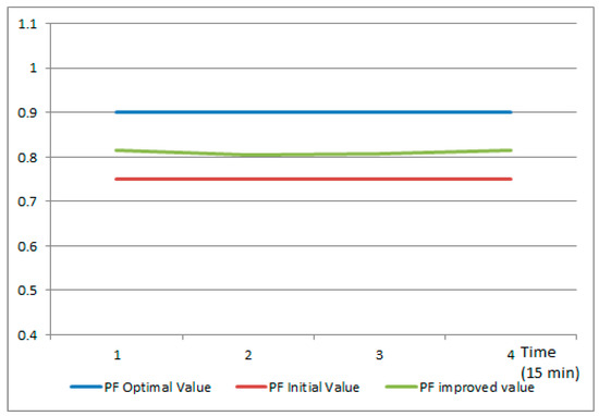 Figure 10 shows the power factor value in the initial situation (the red line), the optimal value targeted in the frequency restoration reserve service (the blue line) and the PF value after the new second level VPP is created, activated, and used to compensate the reactive power from microgrid 4 (the green line). As a result, the PF value gets close to the optimal value stabilizing the voltage, thus the potential unbalances are locally addressed and is not escalated to the main grid level.