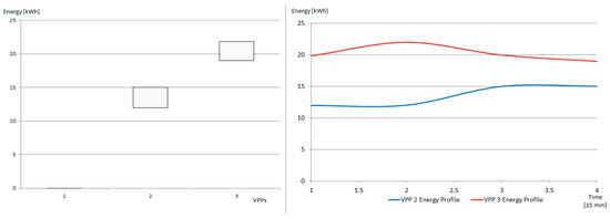 VPPs in the new created hierarchical VPP: [LEFT] maximum and minimum energy consumption in the service interval and [RIGHT] detailed energy profiles.