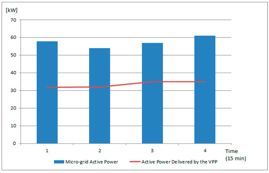 The active power profiles of level one VPP2 and VPP3 (see Figure 6) consisting of 16 prosumers activated from the micro-grids that create the higher level VPP4 to compensate for the low PF of microgrid 4 are shown in Figure 11. Each prosumer has a different PF value, being able to compensate together for the imbalance between the active and reactive power from the grid. The final grid situation is shown in Figure 12. It can be seen that the reactive power has been decreased by adding additional energy prosumers with a leading power factor. Furthermore, the active power in the grid has increased by around 30 kW because of the new prosumers that have been activated and grouped the VPP, whose total active power contribution is shown with the red line.