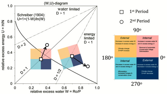- External (climate-induced) processes change the climate forcing, which can be visualized as the vector components in the direction of the negative diagonal towards the second yellow or the fourth dark blue quadrant. For example, given E = constant, for increasing (decreasing) aridity dD > 0 (< 0), one obtains an increasing (decreasing) energy excess U = 1 − E/N and decreasing (increasing) water excess, W = 1 − E/P;