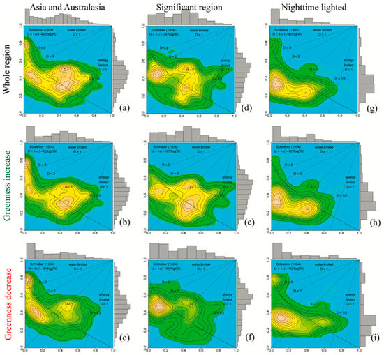 - Vegetation decrease (Figure 2, bottom row): Unlike regions of increased vegetation greenness (Figure 2, middle row), climate change and anthropogenic activity contributed negatively to the three land surface modes associated with vegetation greenness reduction, and they revealed unique distribution patterns: Asia and Australasia were characterized by a trimodal distribution with one mode aligned along D = 1 and the other two modes separated by dryness differentiation (1 < D < 2 and D > 3). The dominant mode of Asian and Australasian greenness decrease was concentrated in the water-limited domain, and a similar distribution could be found in the nighttime lighted cities. That is, cities located in the water-limited domain were more likely to show decreasing vegetation greenness. The mass of significant (U,W) change was concentrated in the water-limited domain, but tended to move closer to the Schreiber (Equation (6)) curve.
