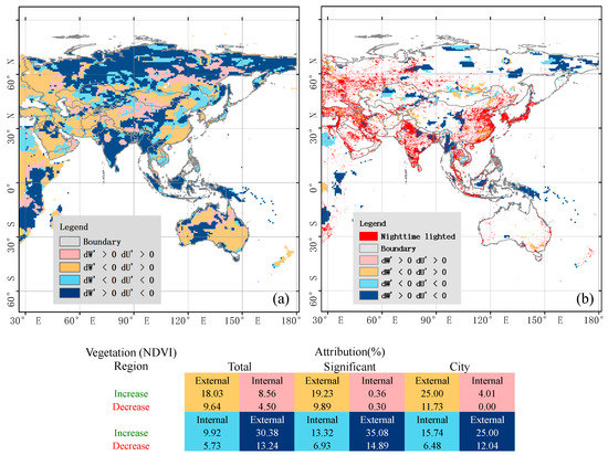 Distributions and statistics of attribution classes of (a) ecohydrological and (b) significant ecohydrological change in Asia and Australasia separating internal from external causes in three land surface states, characterizing the mean and its change and the mean of urbanization of the land surface.