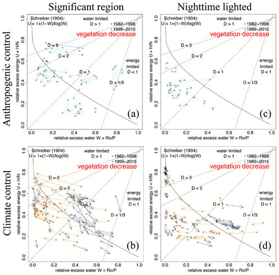 In general, the pixel distributions of the three climate mean states in (U,W) space (Figure 2, upper row) showed structurally similar patterns without considering vegetation greenness change and for increased greenness regions (Figure 2, middle row). However, decreasing vegetation greenness regions (Figure 2, bottom row) showed different energy–water dependence and urbanization dependence as noted in the above. Thus, it is reasonable to attribute state change trajectories in (U,W) space to external (or climate) and internal (or anthropogenic) causes over the decreasing vegetation greenness regions and diagnose the underlying negative climate vegetation and urbanization relations.